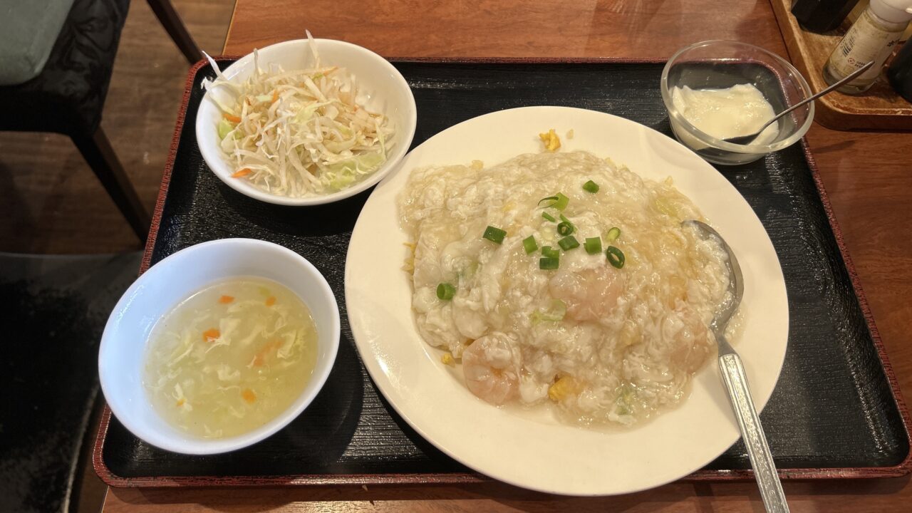 但しメニュー名にあるえび、かに、肉については疑問、確かにえびは3尾ありましたがかに、肉については見当たりません。一歩譲ってかに肉のことかとも思いましたが、餡掛けの中にも存在感は無し、何はともあれ美味しかったので満足はしました。ご馳走様!