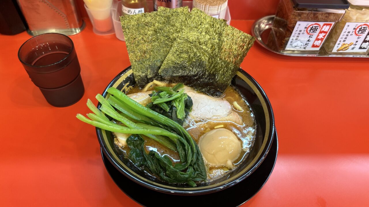 東京都高円寺駅南口から徒歩2分の大輝家直系 麺家 暁にてラーメンに味玉で1000円。4日前にオープンした家系ラーメンの店で野中家と並び出店ラッシュの大輝家系列です。