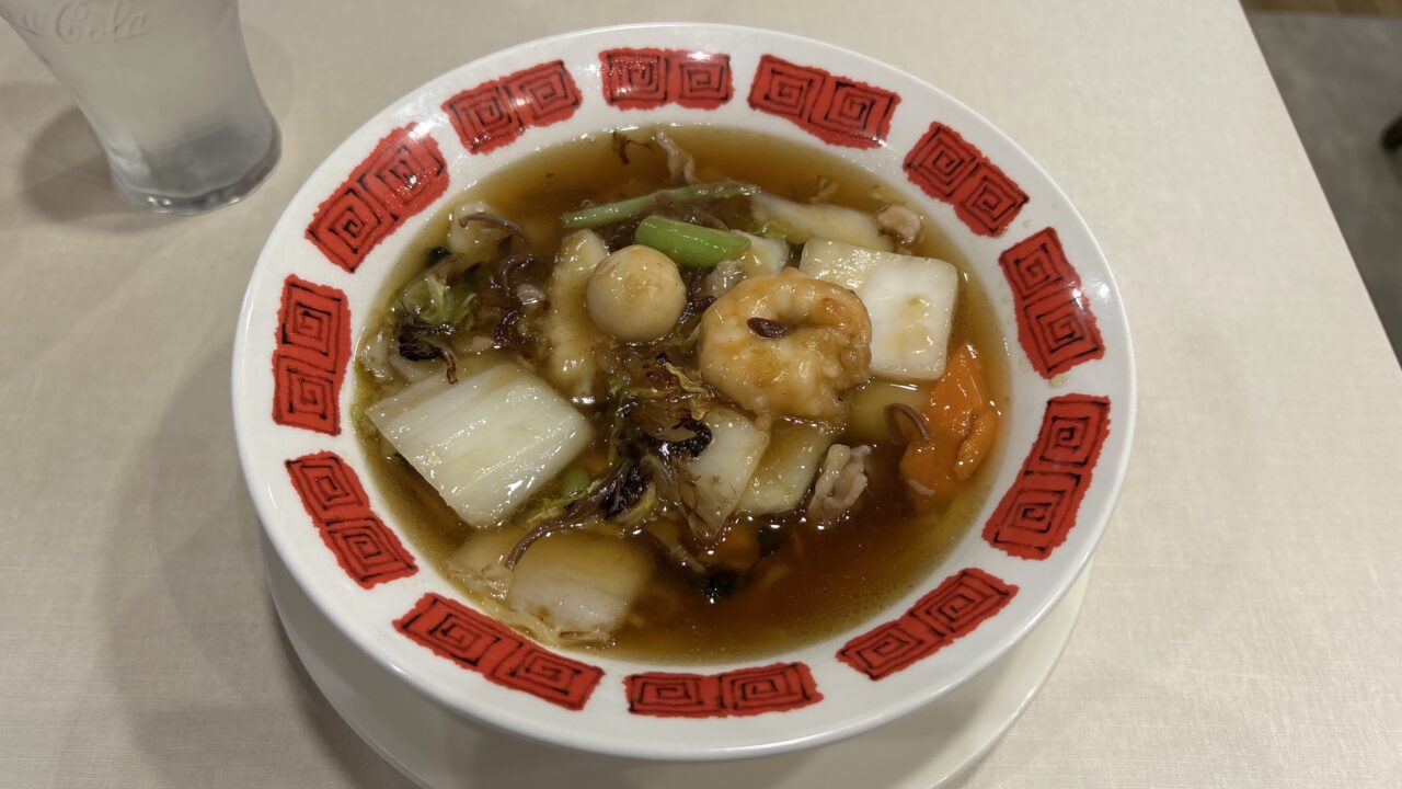 五目麺はあんかけラーメンですね。具材は海老、イカ、豚肉、うずらに野菜となります。海老、イカだけでなくうずらも油通ししてあるのはさすがです。